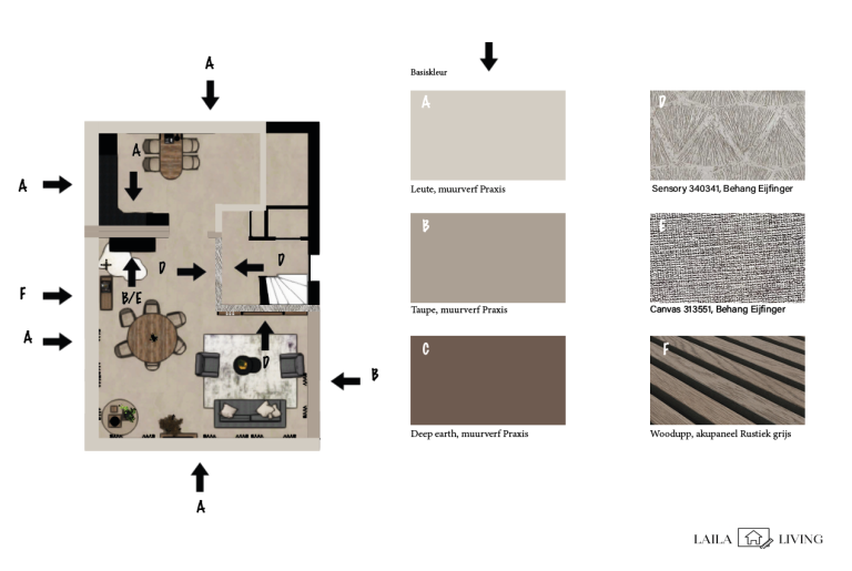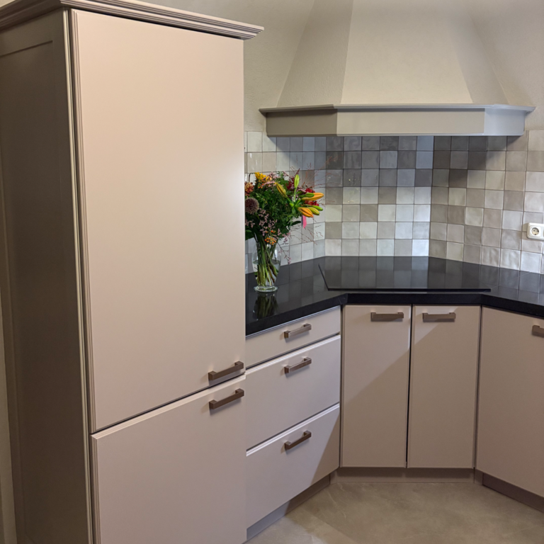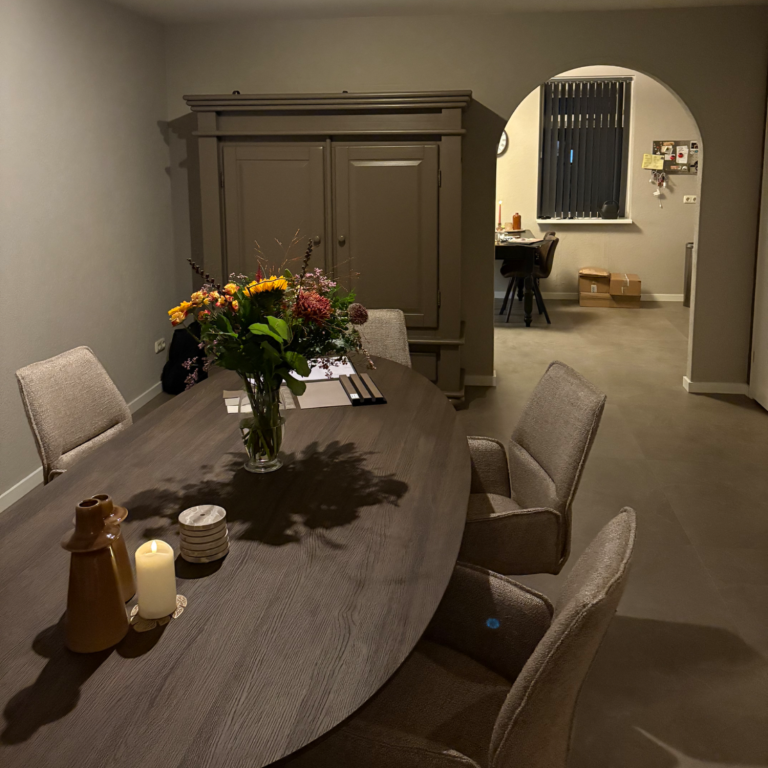 Voor deze klanten mocht ik aan de slag met het premium pakket. Samen kozen we voor een landelijke, moderne stijl: warm, tijdloos en toch eigentijds. Ik hielp bij het bepalen van de kleuren, de tv-kast, de keuken en de meubels, zodat alles een geheel vormt.